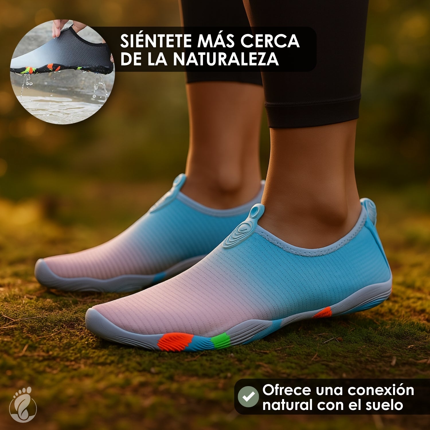 Con una suela flexible de 4 mm y material transpirable ultraligero, sentirás alivio en tus articulaciones, mejorarás tu postura y recuperarás la sensación natural al caminar.