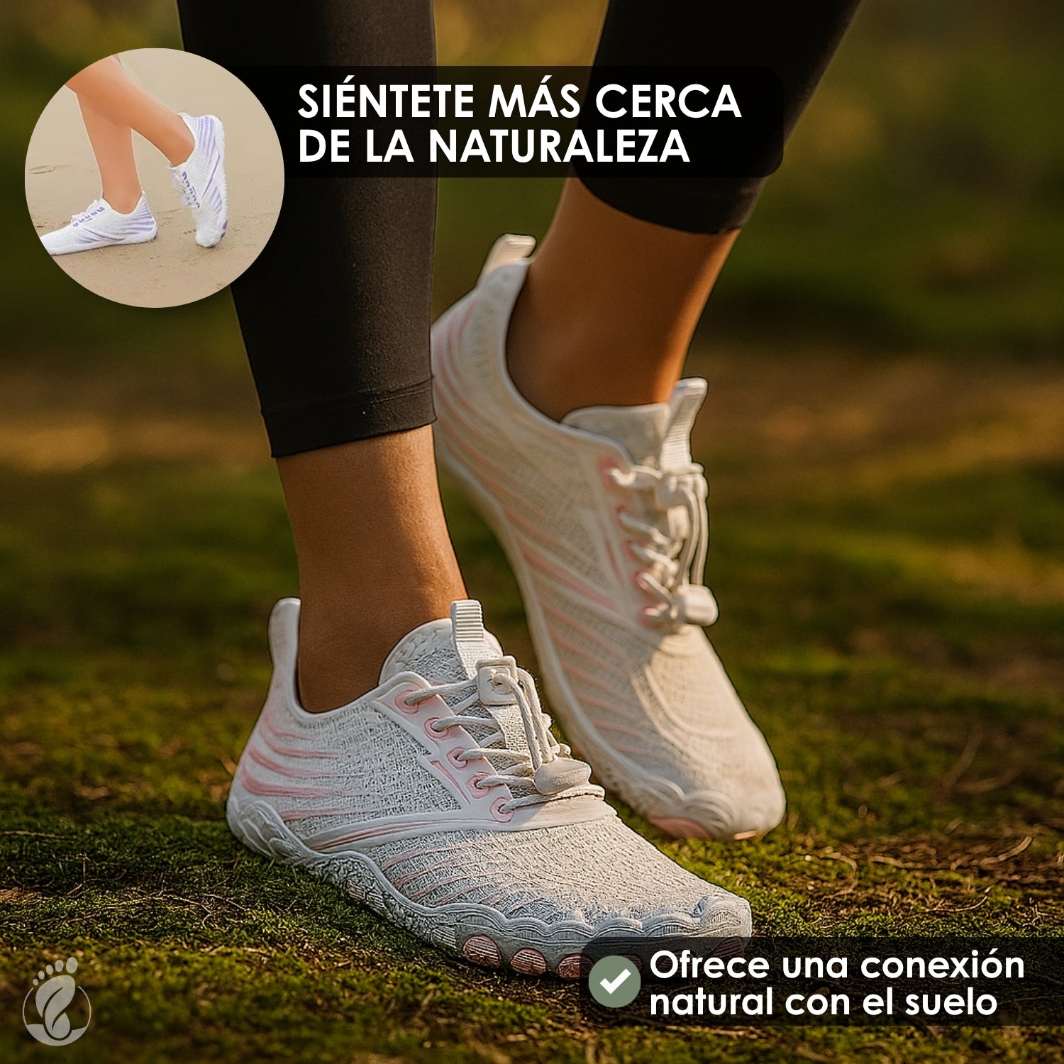 La suela flexible se adapta a cualquier superficie, proporcionando una conexión real con el suelo y permitiendo que cada pisada se sienta ligera, cómoda y segura. Esta libertad potencia la movilidad de los dedos, facilita la correcta alineación corporal y mantiene el equilibrio natural que tu cuerpo necesita.