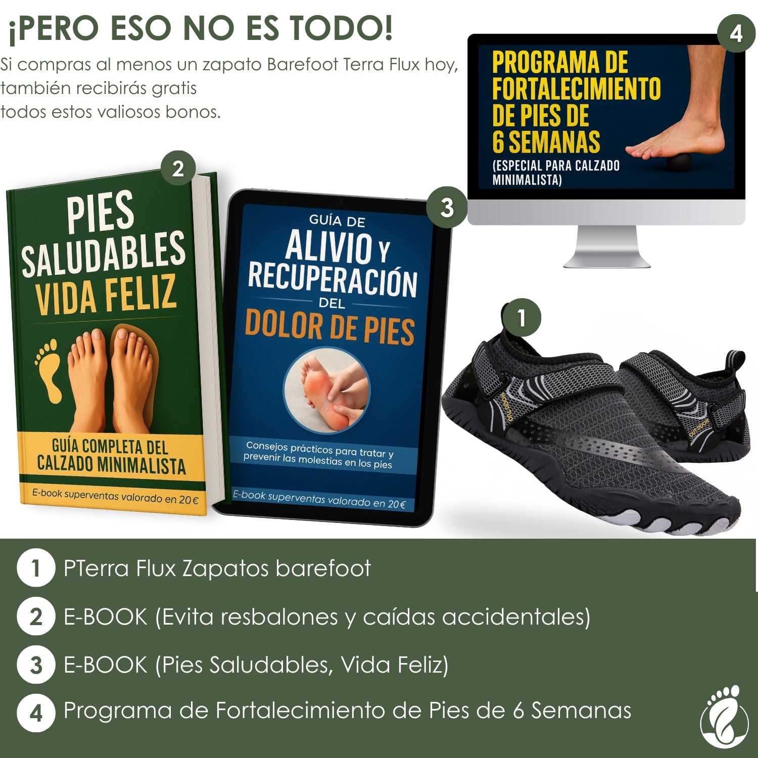 La forma sigue a la función: Terra Flux Zapatos barefoot respetan la anatomía natural del pie, con una puntera ancha que deja espacio a los dedos, una estructura flexible y materiales que permiten transpirar sin irritaciones. Podiatras y fisioterapeutas recomiendan este tipo de calzado para aliviar desequilibrios posturales, dolores de rodilla o tensión lumbar, y favorecer la marcha natural. Son ideales para el uso diario, caminatas prolongadas o entornos laborales donde necesitas comodidad sin comprometer la salud del pie. Notarás una mejora en tu alineación corporal, equilibrio y bienestar general.